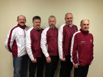 Latvijas senioru izlases sastāvs: Pēteris Šveisbergs, Jānis Rēdlihs, Ivars Černajs, Aivars Purmalis, Aivars Gulbis, treneris Ansis Regža.