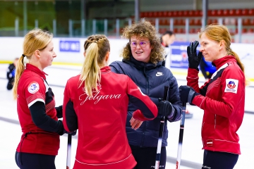 Latvijas olimpiskās sieviešu izlases sastāvs: Santa Blumberga-Bērziņa (skips), Evelīna Barone, Ieva Krusta, Ieva Rudzīte, Tīna Siliņa, treneris Ritvars Gulbis.