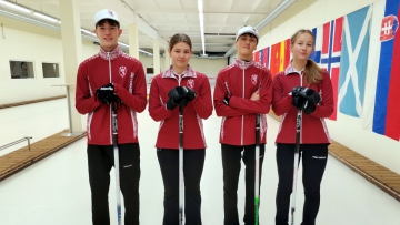 Latvijas izlases sastāvs: Kristaps Zass (skips), Agate Regža, Toms Sondors, Marija Seļiverstova un trenere Evita Regža.