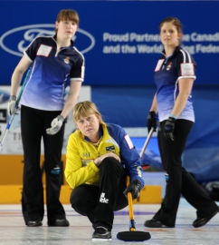 22. martā pirmajā play-off spēlē, kas norisinājās starp Zviedriju un Skotiju, tika noskaidrota pirmā fināliste. Līdz pat astotajam mendam Zviedrijas komanda kontrolēja spēles gaitu. Pirmais ends noslēdzās bez punktiem. Otrajā endā zviedrietes guva divus punktus. Trešā enda beigās Zviedrija mājā bija izveidojusi sev labvēlīgu situāciju, novietojot mājā četrus akmeņus, tomēr skotietes ar pēdējo akmeni laboja situāciju un guva vienu punktu. Ceturtajā endā punktu guva atkal zviedrietes, panākot sev labvēlīgu rezultātu 3-1. Skotija nepadevās un guva punktu piektajā endā. Septītajā endā Skotija ar pēdējo metienu izcīnīja vienu punktu, lai gan situācija bija diezgan draudīga, jo mājā atradās pieci Zviedrijas akmeņi. Astotajā endā Skotijai izdevās nozagt divus punktus, panākot rezultātu 4-5 sev par labu. Devītajā endā neviena no komandām neguva punktus. Desmitajā endā Zviedrijas komanda atkal parādīja savu pārākumu, gūstot trīs punktus un spēle noslēdzās ar rezultātu 7-5.